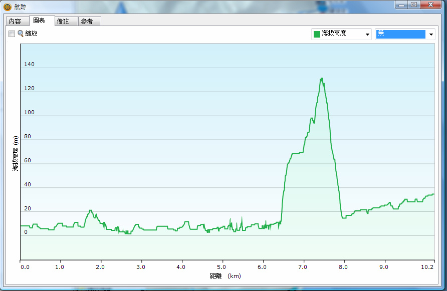 【一共走了10.2公里,花了5小時(含靜止1小時46分),高度約120公尺】