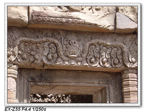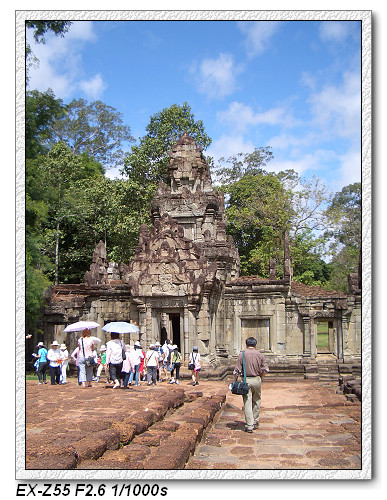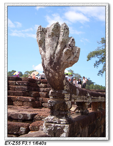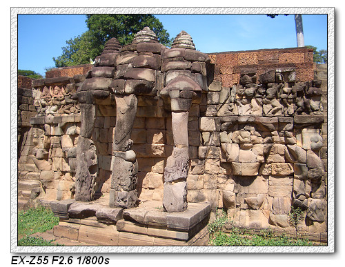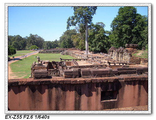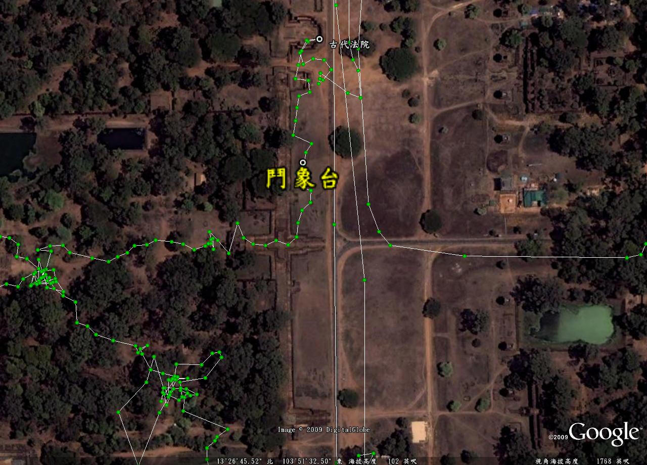 根據元代周達觀的『真臘風土記』,說明如下:『宫室﹕國宫及官舎府第皆面東。國宫在金塔、金橋之北,近門,周圍可五六里。其正室之瓦以鉛為之,餘皆土瓦。黄色橋柱甚巨,皆雕畫佛形。屋頭壯觀,修廊複道,突兀參差,稍有規模。其莅事處有金欞,左右方柱上有鏡,約有四五十面,列放於窗之旁。其下為象形。』另外一段文字則描述著:『國宫之對岸有小石塔十二座』。
