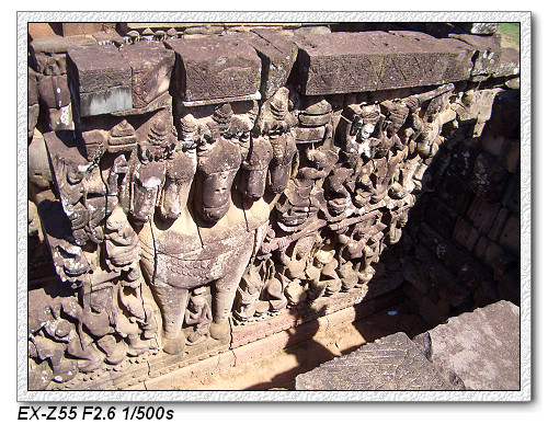 鬥象台名稱的由來,是因為考古學者見平台前後雕刻的都是象,姑且為其取名『象的平台』(Terrace of the Elephants)。鬥象台是蘇耶跋摩一世(Suryavarman I)的傑作,平台位於大吳哥城之中央,由巴普昂寺(Baphuon)延伸到癲王台(Terrace of the Leper King),長達 300 米,包含主要平台及兩個附屬之平台。南面之梯級兩旁飾有3頭之象,正在用象鼻集合蓮花,再往前之3米高連續牆身,刻有打獵之大象。中間之梯級,則以 Garuda (鳥神) 和獅子作為裝飾。在大象台階北端,外牆之後面,有一個極之精美之石刻五頭之馬,從馬頭上之多層皇幡裝飾,應該代表王帝用之馬匹。馬後面圍繞著飛天女,及一些面目恐怖之魔鬼,追趕著一些受驚之人。