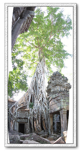 19世紀被法國人發現後,百年老樹早將神廟緊緊纏著,因此放棄修復,保留了原貌。樹根放肆地不斷延伸,繞著屋簷、探入石縫、將老廟牢牢裹著。這裡的樹分作兩種,較大棵的是木棉樹,他比較粗大且呈淡褐色,而且有多癤的樹根。較小棵的則是絞殺榕,他樹根呈灰色也比較細,但是四處糾結纏繞。塔普倫神廟,它的許多宮牆、城門為參天的巨樹所盤據,蛇樹的根莖穿繞在樑柱、石縫、屋簷、門窗之間。