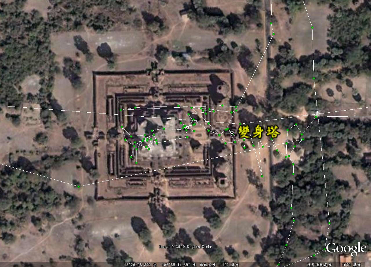 變身塔在東側通往神龕塔階梯前有座長方形的石檯,底座是破壞神(Siva)的坐騎黃牛 (Nandi) 的雕像,兩側為如煙囪般尖高的火化骨灰塔,在東北角還有間小室,內有洗骨灰池,當時是以椰子汁來洗,然後放在棉花上吸乾,最後放進骨灰罈,小室並附設排水孔,全為沙岩築成。吳哥的建築有個特點,多數神殿佛寺會蓋得很高聳,需要依靠階梯登頂,而階梯也會異常狹窄及陡峭,每階約都有小腿那麼高,增添許多爬的困難,這是代表對神的崇敬