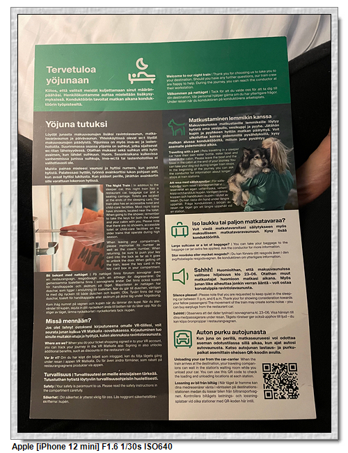 今晚要搭夜鋪火車前往羅瓦涅米。前往羅瓦涅米可以選擇搭飛機or火車,我們選擇夜鋪火車可以省一晚的住宿費。