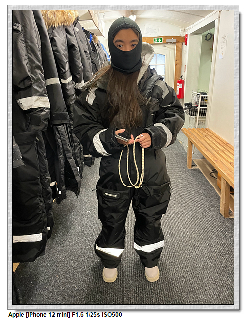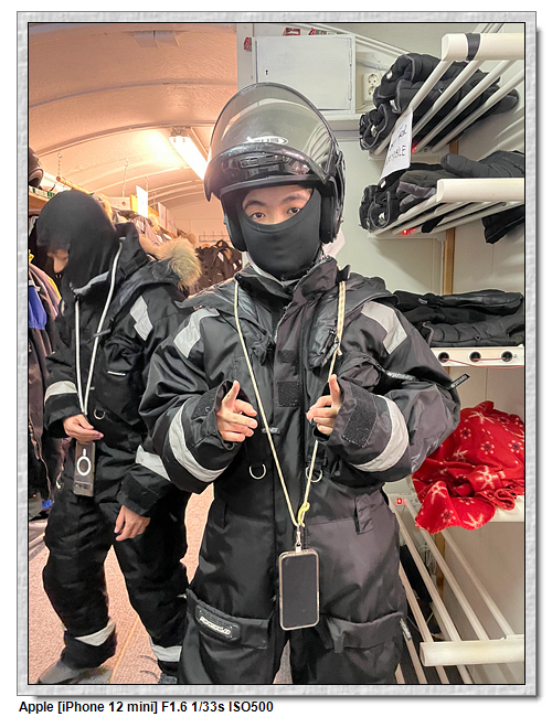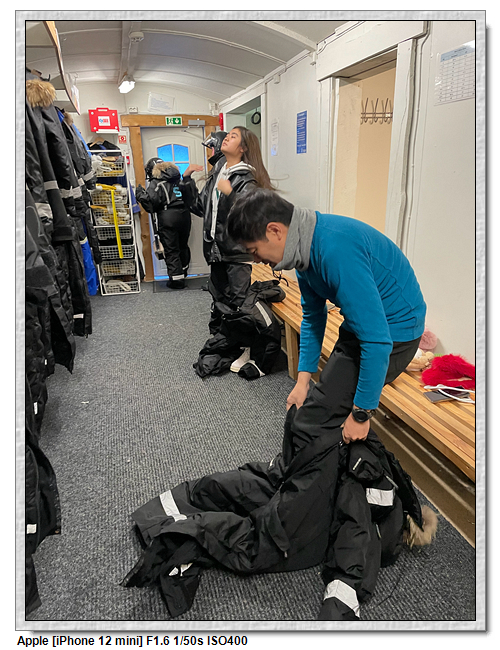 這次換裝比較不一樣,自己的外套要穿在裡面,沒換鞋子,只有詢問鞋子暖不暖和,如果可以就不用換,後來知道全程都沒下車,所以可以不用換。