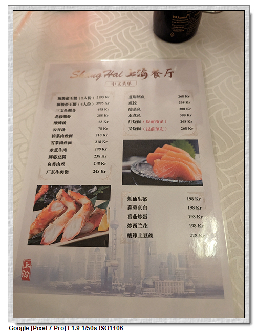 小羽懷念中式料理,所以晚餐我們選擇吃上海餐廳。一進餐廳,老闆看了我們是華人臉孔,二話不說直接給中文菜單。