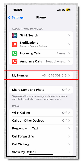 iPhone:設定 -> 電話 -> 本機號碼