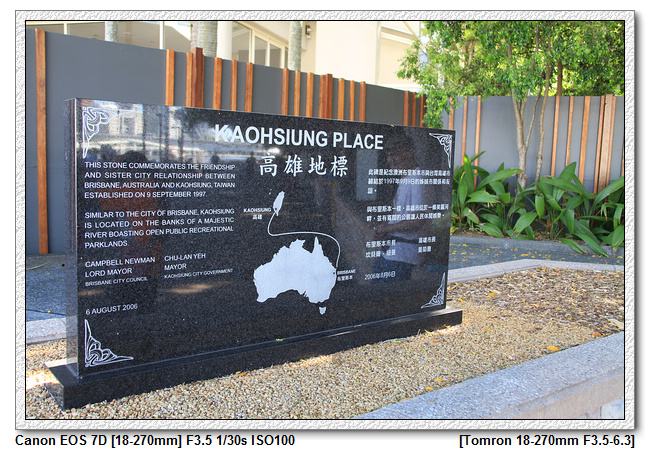 對於台灣而言,這裡有個必看的地標,1997年9月9日高雄市與布里斯本因同為水岸城市結為姊妹市,所立的地標。