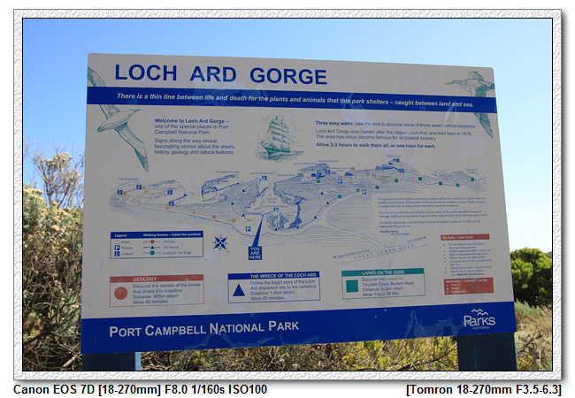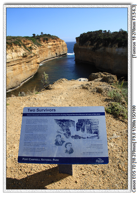 Loch Ard其實是一艘船名,1878年3月2號從英國出發,開往墨爾本,搭載了18名乘客與36名船員,經過了三個月的航行後,終於快到達目的地,在5月31號的晚上,船員們還開了Party慶祝即將到港,結果在隔天6月1號因濃霧瀰漫,船在經過這個峽谷的時候遇難了。54名船員與乘客,只有兩位倖存,Tom(男) & Eva(女)。