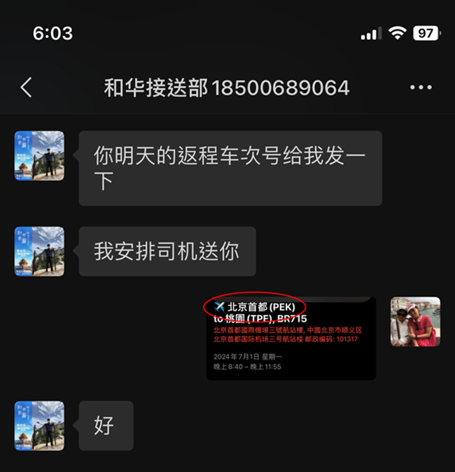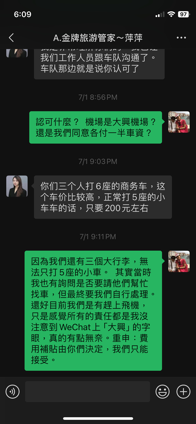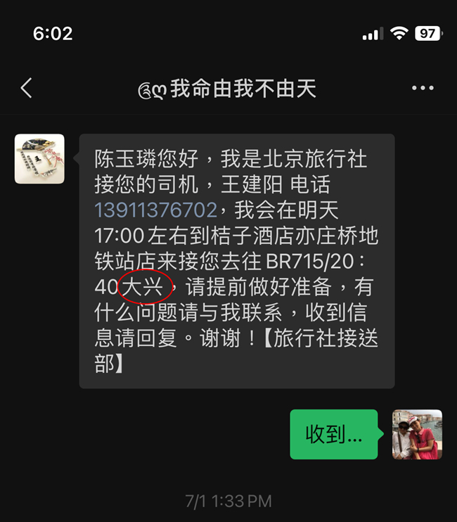 果然司機的目的是大興國際機場,抵達後,我們表示要去的機場是首都國際機場,原本司機打算送我們去首都機場,但回報後,改口說不能送我們去,他還有其他單要接,叫我們跟旅行社聯絡。
