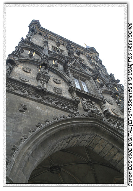 火藥塔是11世紀興建舊城時所建的13座城門之一,當時從銀礦產地運來的貴重銀器與錢幣就是從這個城門進入布拉格。另外,國王的加冕典禮遊行,也會從火藥塔經過。火藥塔參照舊城橋塔搭建成哥德式建築,與典型軍事防禦型城門不同,以豐富的雕飾取勝。到了17世紀,成為存放軍火的地方因而得火藥塔之名。
