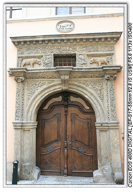 兩隻金熊之屋,名稱自於正面拱型入口上有兩隻金色熊的標誌。這棟建築物原本是哥德式建築,後來16世紀時改建成文藝復興式房舍。