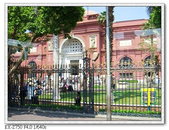 到達「開羅博物館」,入眼是一紅色建築物,進入前每個人皆須經過X光安檢,才能進入博物館前廣場。之後所有的景點皆有X光安檢,包含一般飯店也有裝設X光機。(沒辦法,觀光目前是埃及的生命。自從上次"喋血事件"之後,埃及政府就很緊張了,江浩說,那時他有2年沒工作~)
