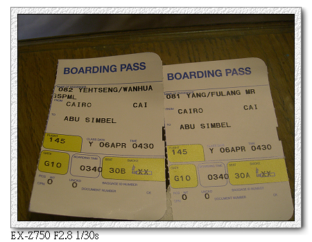 原本預計本第二小隊應是最後到達,但沒想到卻是出奇的順利。從開羅出發,搭乘埃及航空內陸飛機,先在亞斯文短暫停留後,再飛阿布辛貝。不知是不是機長飛太慢,到亞斯文時停留不到30分鐘(連下飛機都沒有),馬上起飛至阿布辛貝。結果我們竟然最先到。打電話給江浩時,江浩還一度以為我們坐錯飛機,下錯站。後來聽阿洲說,原來他們在亞斯文下飛機後就不飛了,停留3個小時後才起飛。難怪阿洲從 桃園機場就一直碎碎念,說埃及航空排班很爛,要有心理準備。現在終於見識到了。