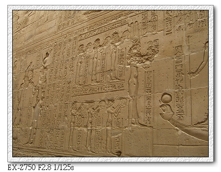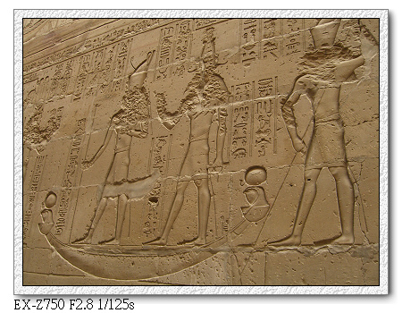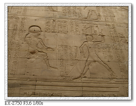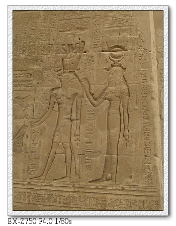 荷魯斯神殿有個特色,壁畫左右對襯,只有一個區別,兩邊國王戴不同皇冠(左:下埃及、右:上埃及)。