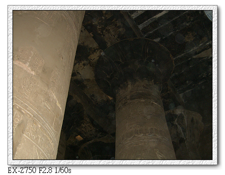 內殿屋頂黑黑的,並非燒掉。而是荷魯斯神殿原本埋在沙裡,這裡有一半都是沙子。有一群怕被羅馬殺害基督教徒躲在這生火30多年,每天冒煙被燻黑的。