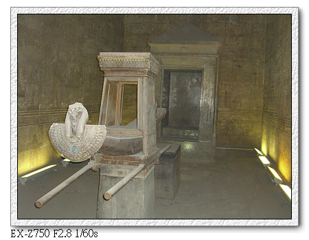 聖壇內有個石櫃,原本有老應像,不見了。前方有個鷹神乘坐的聖船。是膺品,正品在法國。因荷魯斯神殿是法國人發現的,所以被搬到法國了。
