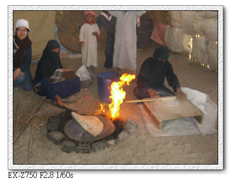 貝都因人的燒餅(照片中是那位小女孩的媽媽),先把麵糰(應該是麵糰吧~)壓扁。
