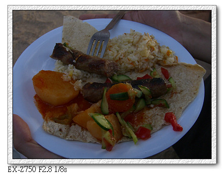 晚餐除了燒餅是貝都因人烤的之外,其餘都是吉普車趕回飯店送來的。