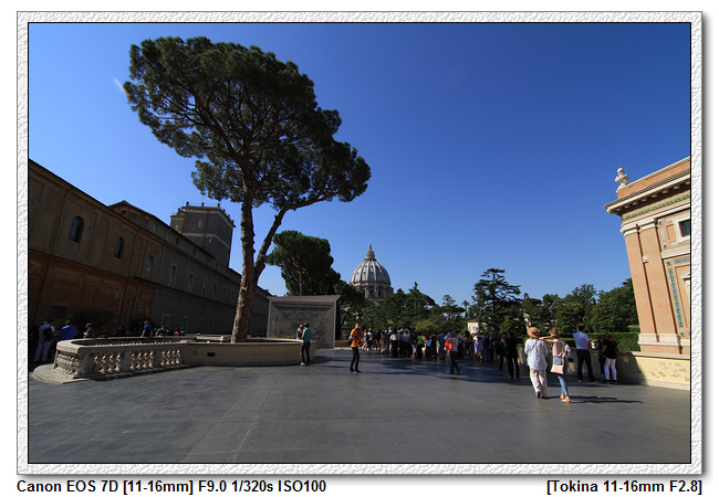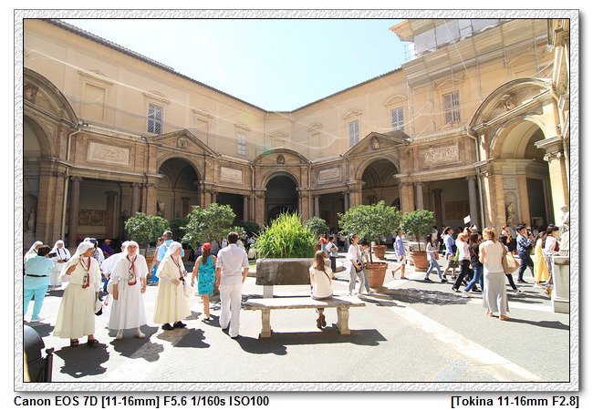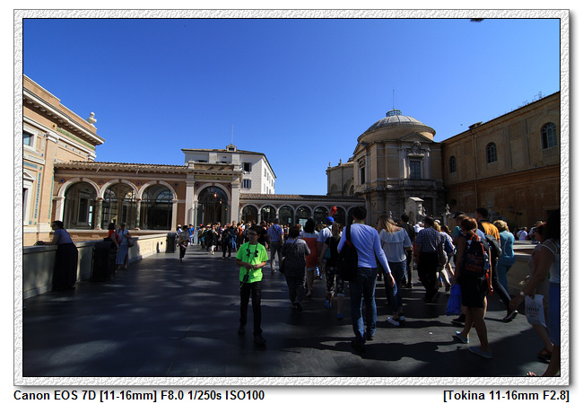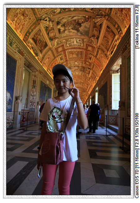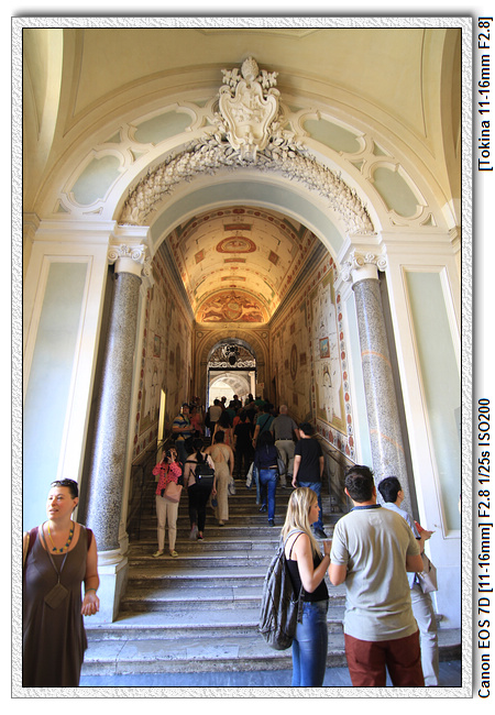西斯汀禮拜堂 Cappella Sistina (唯一博物館不允許拍照的地方),西斯汀禮拜堂建於1445年由當時教宗西斯都四世(Sixtus IV)發起興建,並以他名字命名,為羅馬教皇私用經堂,以及紅衣主教團舉行教宗選舉的地方。這禮拜堂欣賞重點在於高28.8公尺的天花板由米開朗基羅在1508~1512年期間第一次當畫家所繪製的作品 ─ 《創世紀》的九個故事,據說米開朗基羅座畫這四年都沒有脫過他的靴子,使得四年後要脫靴子時皮已經黏著肉了。另外,在畫《創世紀》時除了教宗外,不准別人看,但教宗實在是很想知道他的進度,後來直到教宗下令把他的作畫鷹架拆了,才讓教宗和準備要畫署名室的拉斐爾見識到米開朗基羅在畫作上的那種肌肉線條分明及人物的神韻,使得拉斐爾在畫《雅典學院》時也調整自己的畫風,並將米開朗基羅畫進去,也就是唯一穿靴子的男人。從這些小故事就可見得米開朗基羅是個很執著的人。