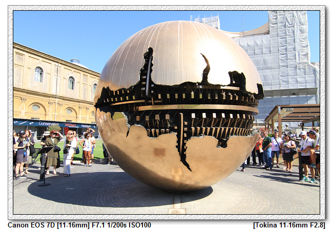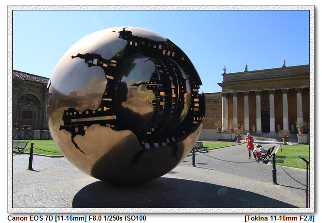 一開始先進入庭院中央,最明顯的是一個巨大的金色球體的雕塑,名為《球中球》,這顆金球是由義大利當代藝術家 Arnaldo Pomodoro 在 1990 年所創作。四周則放置一些待修復的古蹟。這個《球中球》大球裡的確還包藏著小球。據說小球代表地球,大球意喻基督,意味著地球在基督的庇護裡。