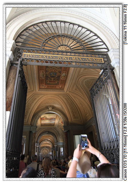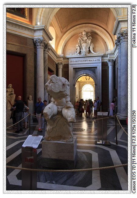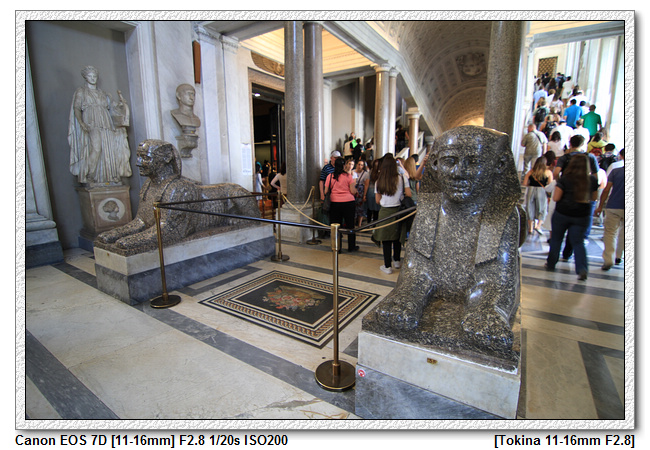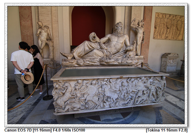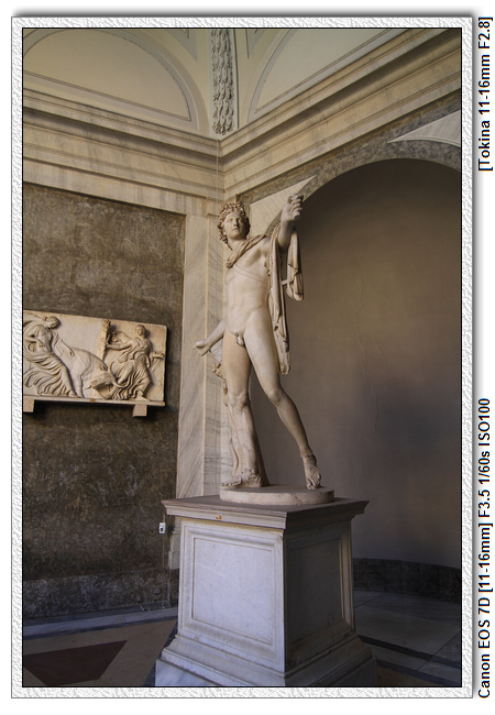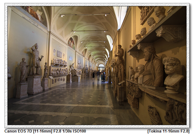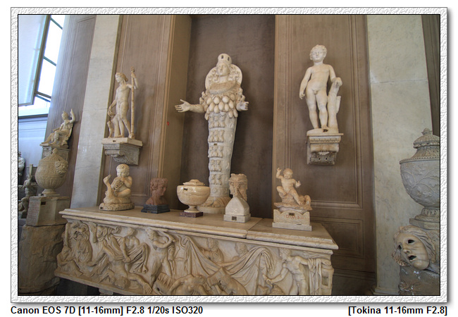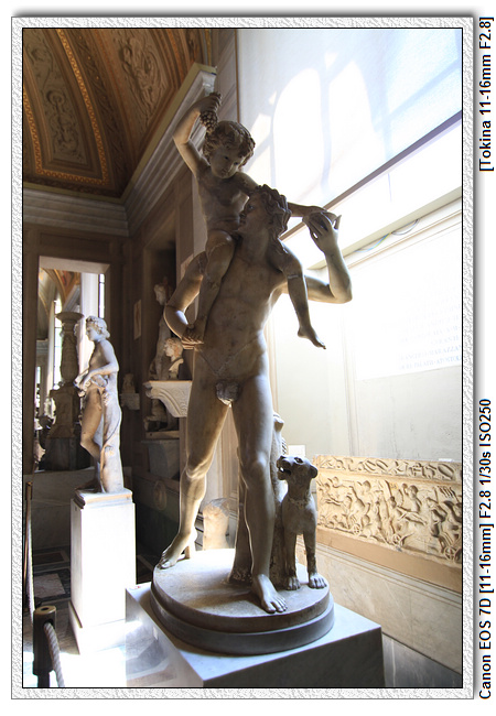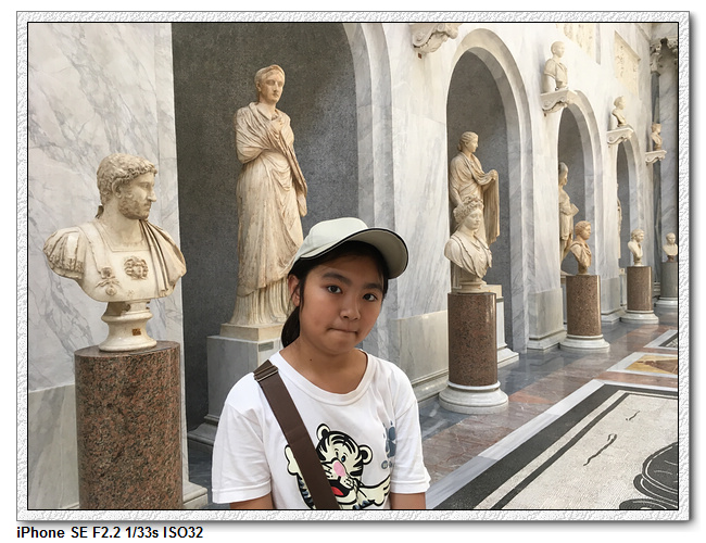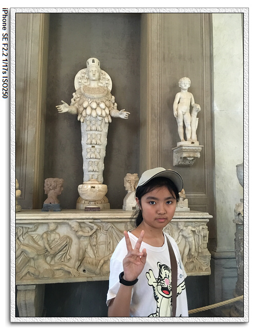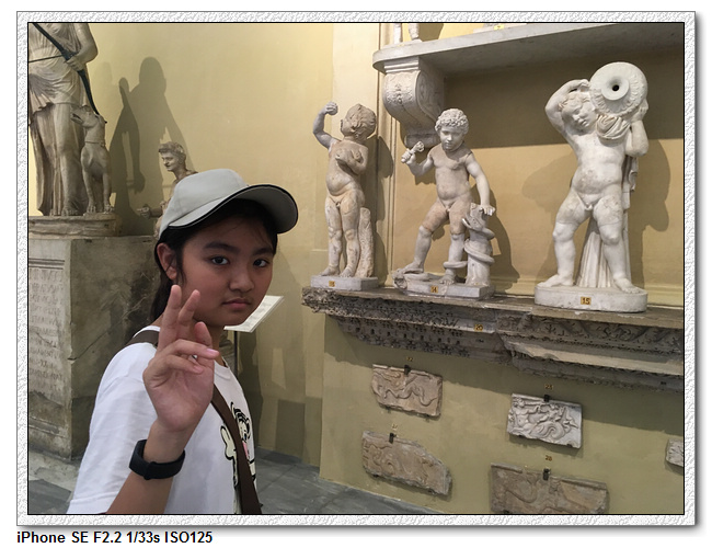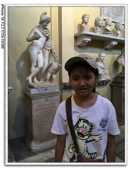 離開松果中庭之後,進入基拉蒙提博物館(Museo Chiaramonti),這裡陳列許多羅馬神祇 、羅馬帝國歷任皇帝等雕刻作品。第一次這麼近距離的看羅馬雕像,真的刻得微妙微翹,雕像身上的衣服皺摺好像是真的衣服一樣,衣服貼在身上的曲線也表現得很真實。有趣的是,很多男性雕像的生殖器,被後人蓋上葉子,顯得很不協調。據說是在1857年,教宗庇護四世覺得男性器官會激起淫慾,所以他拿著榔頭和鑿子,把幾百尊雕像都去勢了,後人替這些被去勢的雕像加上無花果葉遮掩。