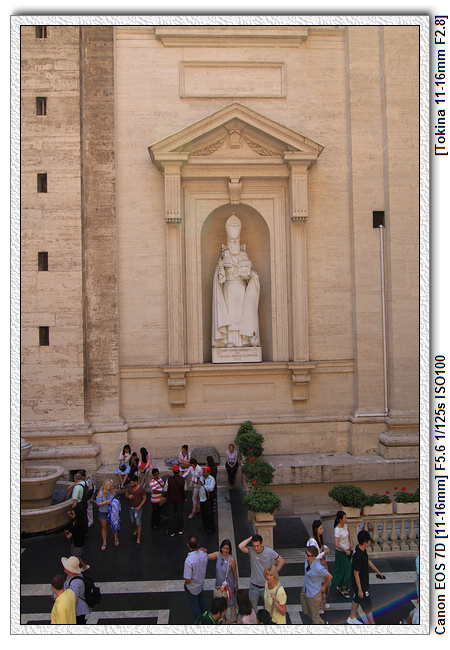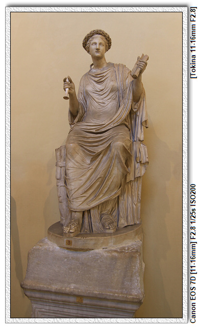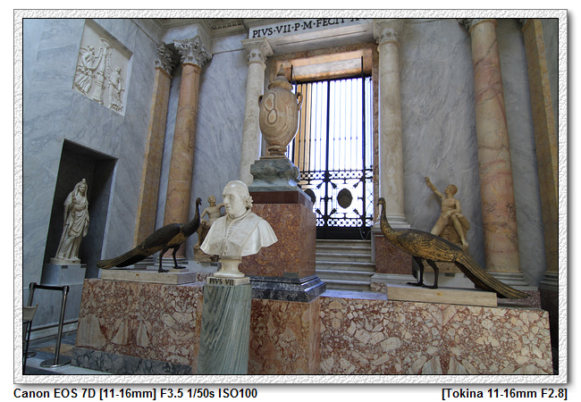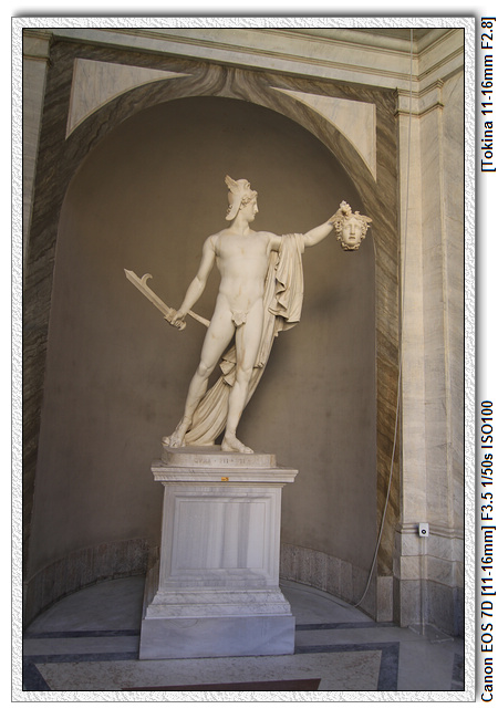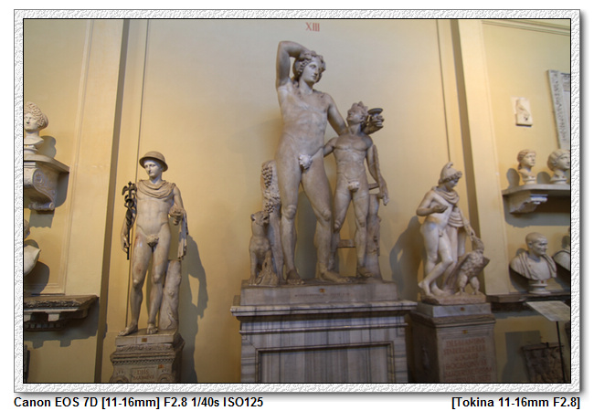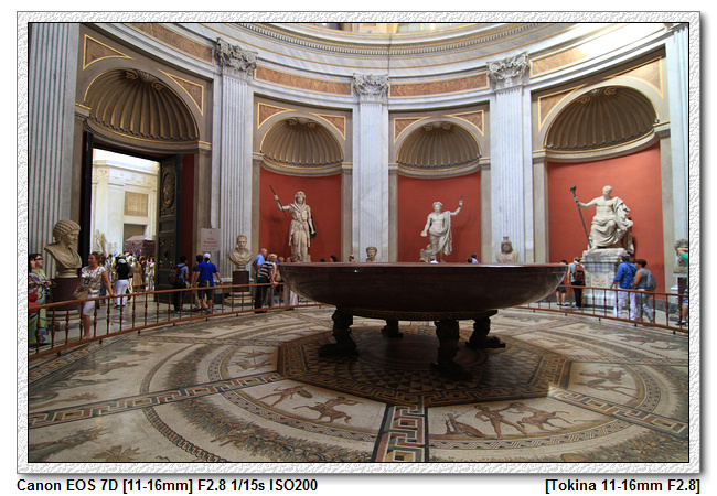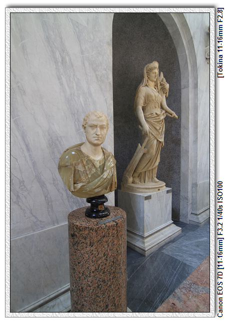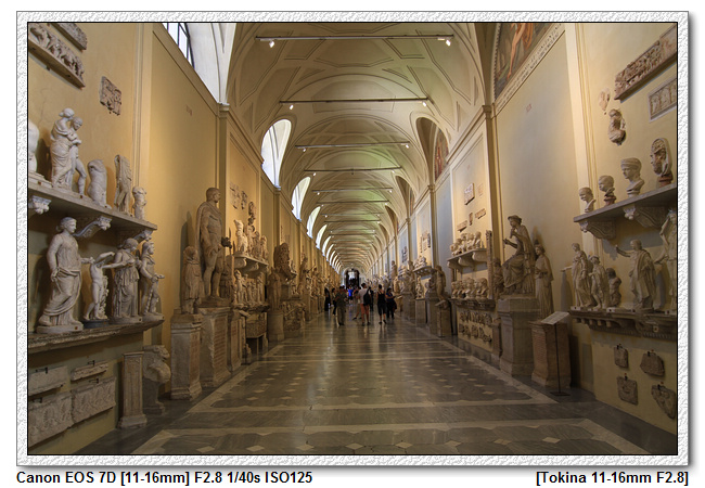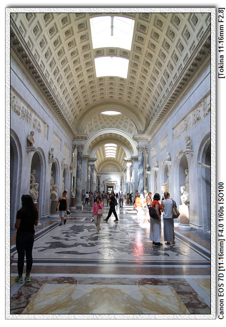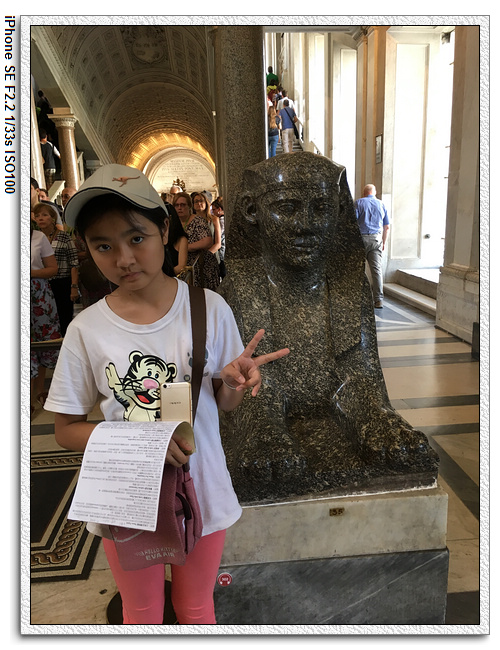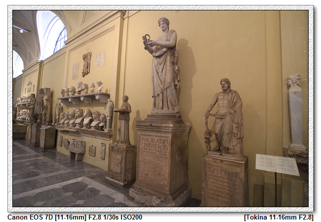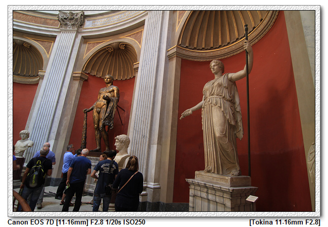離開松果中庭之後,進入基拉蒙提博物館(Museo Chiaramonti),這裡陳列許多羅馬神祇 、羅馬帝國歷任皇帝等雕刻作品。第一次這麼近距離的看羅馬雕像,真的刻得微妙微翹,雕像身上的衣服皺摺好像是真的衣服一樣,衣服貼在身上的曲線也表現得很真實。有趣的是,很多男性雕像的生殖器,被後人蓋上葉子,顯得很不協調。據說是在1857年,教宗庇護四世覺得男性器官會激起淫慾,所以他拿著榔頭和鑿子,把幾百尊雕像都去勢了,後人替這些被去勢的雕像加上無花果葉遮掩。