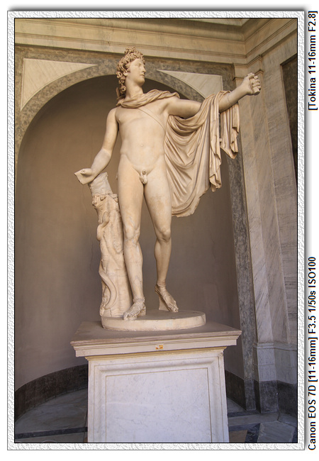 貝爾維德雷的阿波羅雕像(L'Apollo del Belvedere),該作品被公認為西元前4世紀在雅典的希臘雕刻家 Leochares 所創作青銅像的複製品,於西元二世紀用大理石重被後人復製,該調像展現阿波羅俊美臉蛋,身材高大,體型強建又苗條,推測右手應拿著箭,左手拿著弓,刻劃他正趨步向前看射出的箭是否射中目標的情景。但該雕像發現時其實已失去雙臂,於15世紀又重新修復完成。