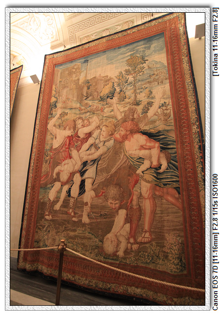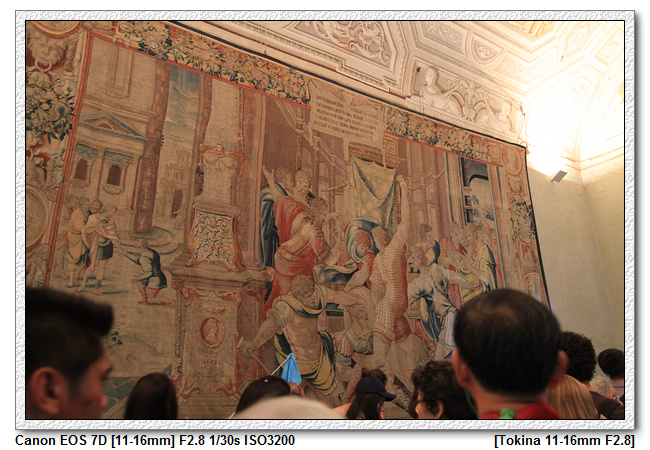 進入掛毯陳列室,裡面一共有19幅巨大掛毯,掛毯裡的都是耶穌生平的事蹟。在早期沒有縫紉機器的時代,這些巨幅都是用人工一針一線編製出來的。在掛毯陳列室,除了顯著的掛毯之外,這裡的天花板也是一絕,都是用畫出來的立體畫。