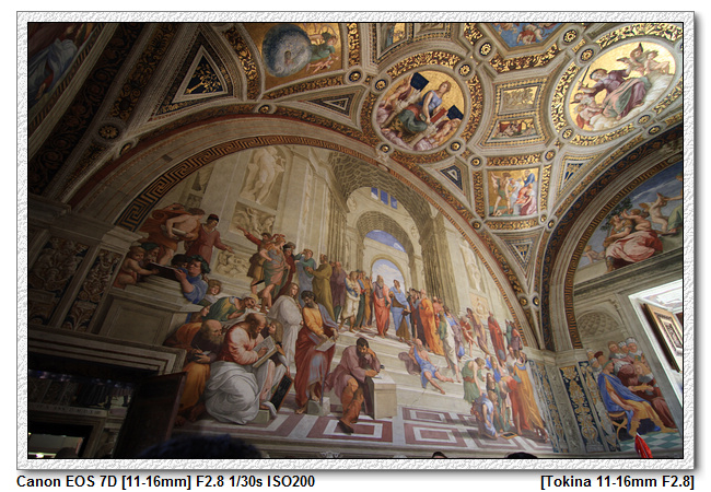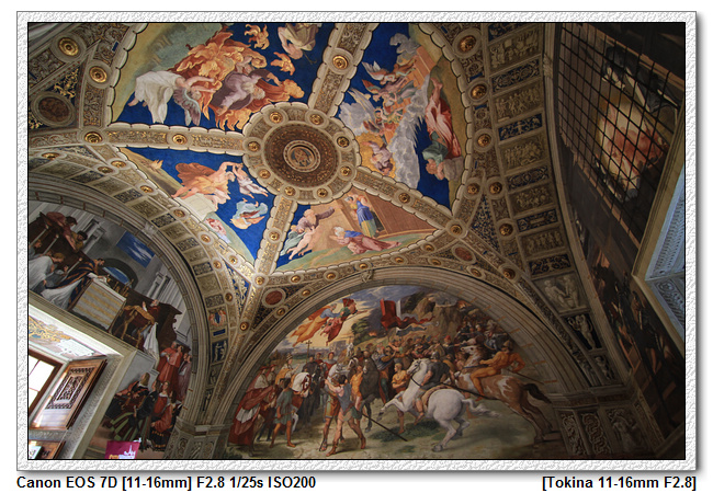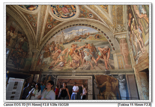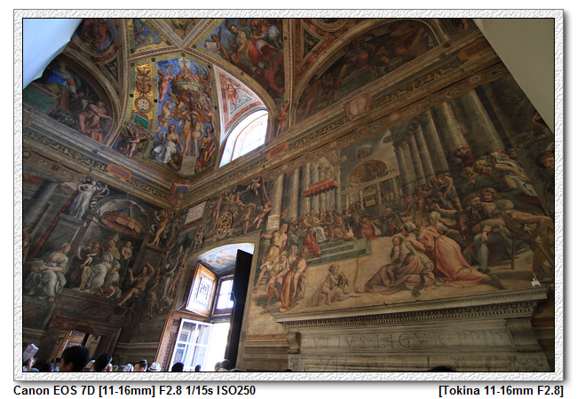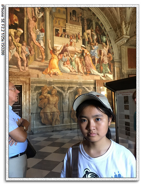 接著來到拉斐爾畫室(Stanze di Raffaello),拉斐爾畫室本來為教宗儒略二世(Giulio II)的私人住所,1508年才找拉斐爾設計四座大廳,直到拉斐爾過世,再由他的學生接手完成。拉斐爾畫風色彩鮮明,多用大量的黃色、紅色、灰白,讓畫作有種溫暖的感覺,並以透視法借助物體大小、遠近呈現立體空間感。 拉斐爾畫室一共有四廳,分別是君士坦丁廳、海力歐多路廳、波哥區火災廳,簽署廳,不過一進去就搞不清楚哪個廳了。