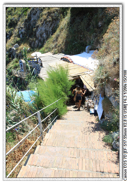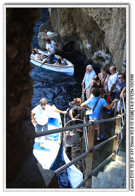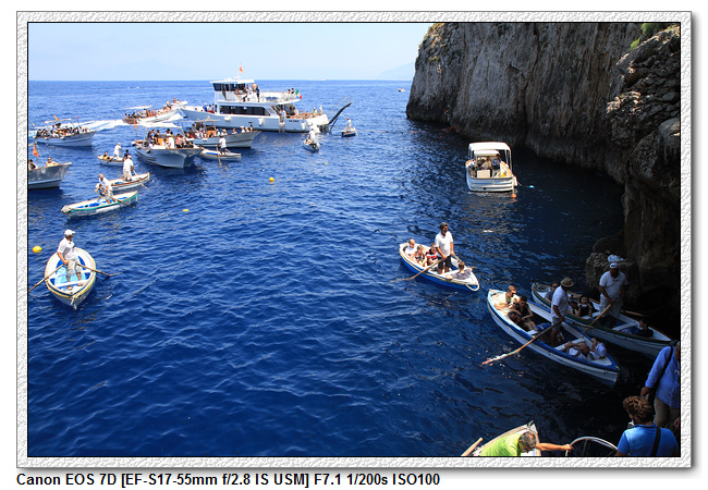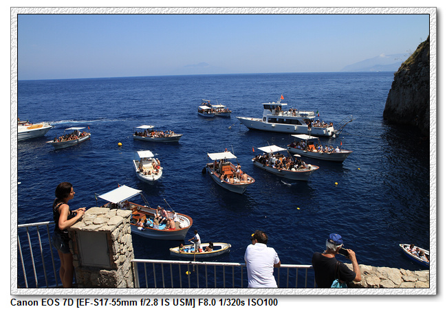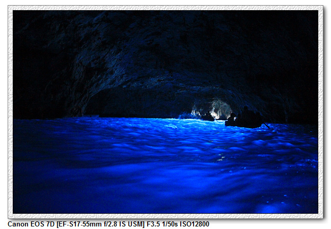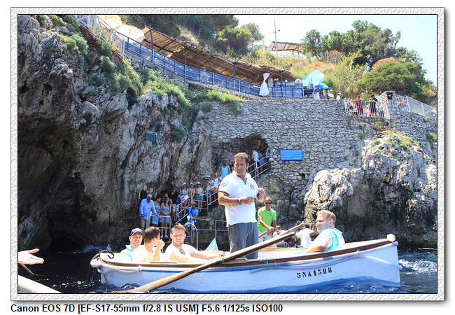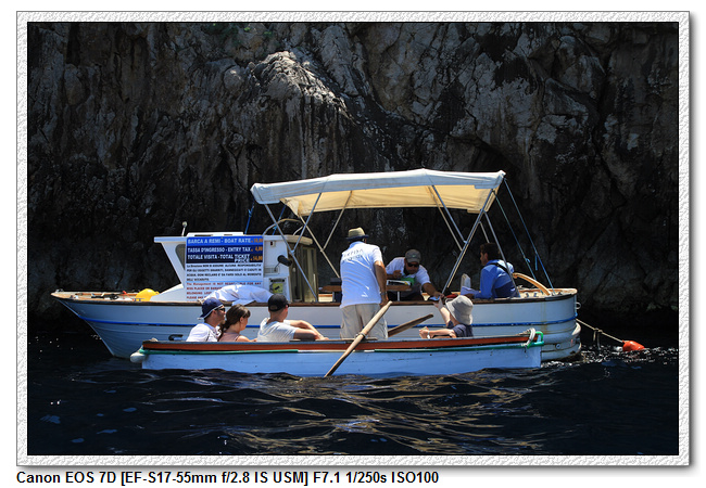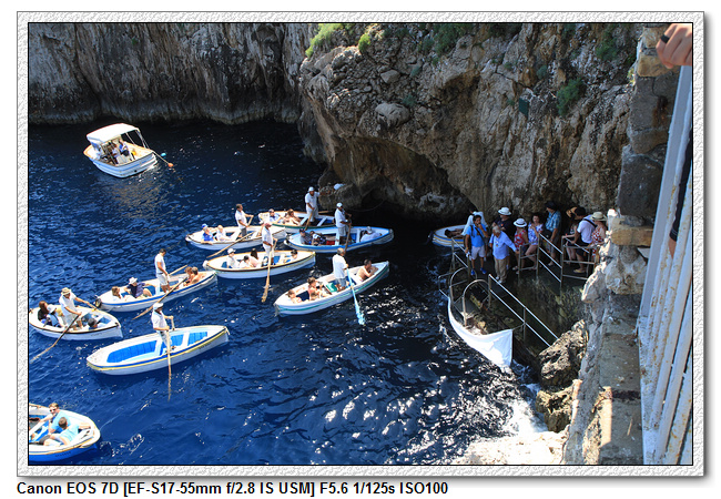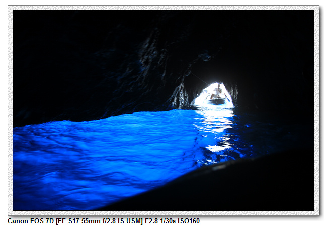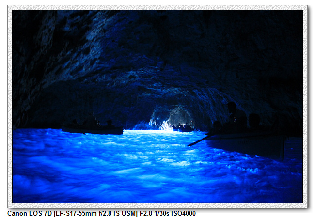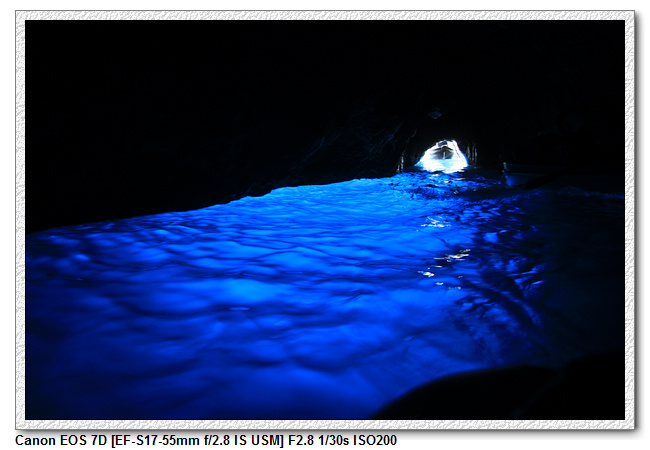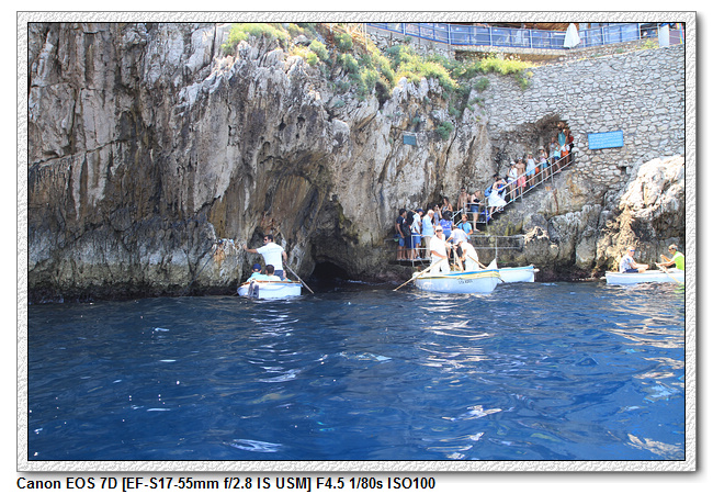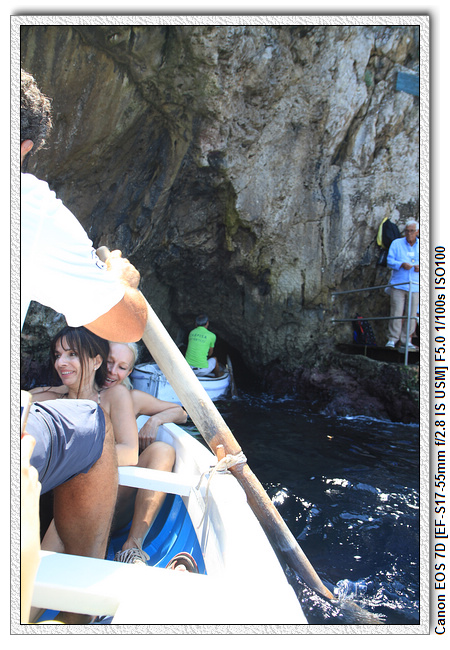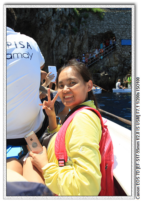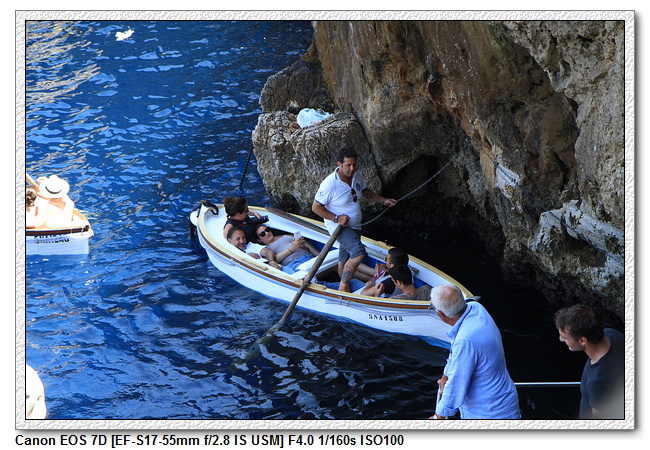 和我們一起坐小船的是兩位穿比基尼、看起來比小羽媽年紀大的開放姊姊,一上船兩個人和船夫一路上一直說話(應該是義大利人,因為說的是義大利語),船夫幾乎沒怎麼理小羽一家三口,除了一開始收費和進入洞口後稍微介紹了一下藍洞的成因,其餘時間(在洞口等待的10分鐘和在藍洞稍微停留的唱歌時間),船夫幾乎是和兩個姊姊打情罵俏了,當然是我們這些聽不懂他們說話內容的臆測。