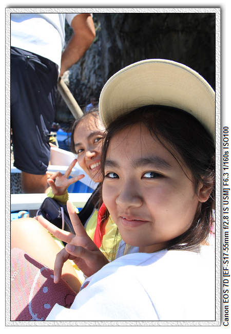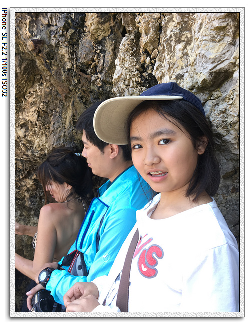 付了錢之後,就在洞口等待,洞口等待的原因是因為一組船進去之後,要等他們全部出來,下一組才能進入。在小船在洞口外等個10分鐘,小羽似乎開始有暈船的現象。
