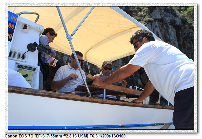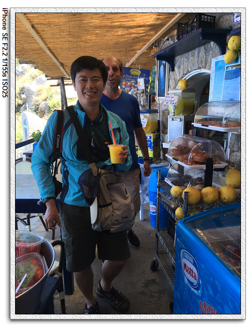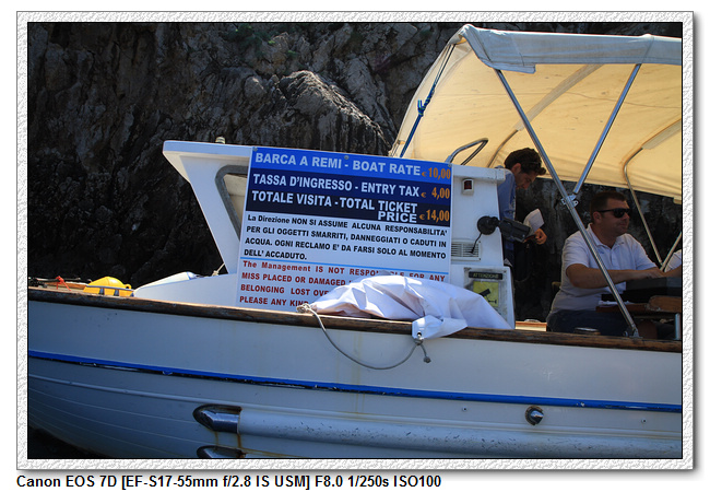 進入藍洞的小船是有公訂價的:一個人船費10歐+入洞費4歐,三個人共42歐。小羽爸媽早就知道要給船夫小費,本來也想好三個人就給個10歐。還沒划到付費小船前,船夫就先跟我們霹哩啪拉說了一堆因為要照顧我們的安全,待會找的錢就當他的小費,因此付船費50歐也沒找零了,但這樣算算,好像省了2歐。