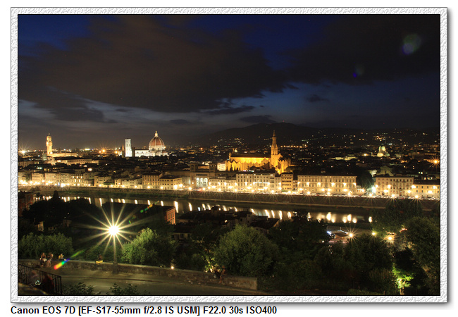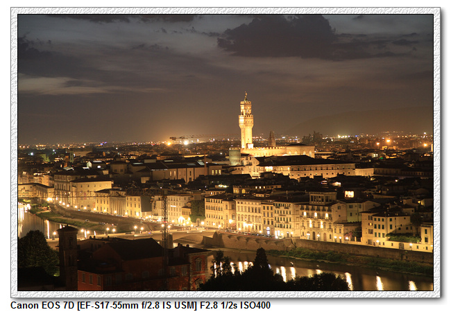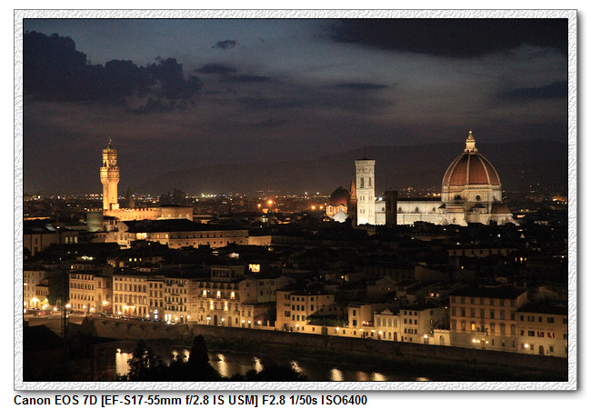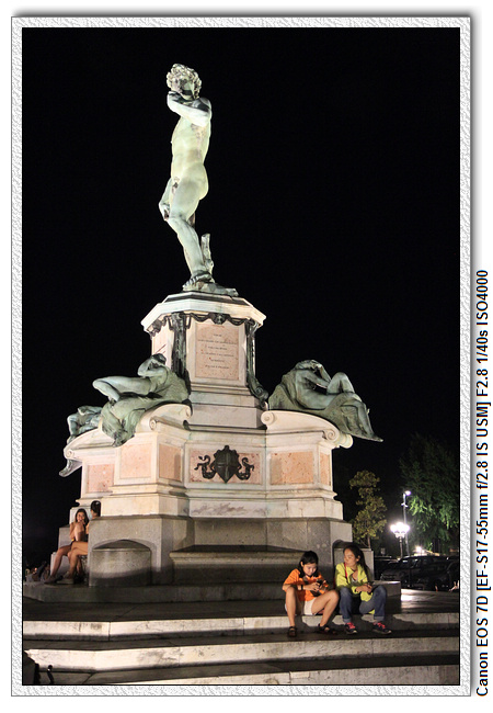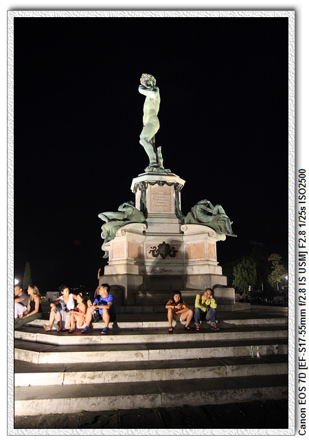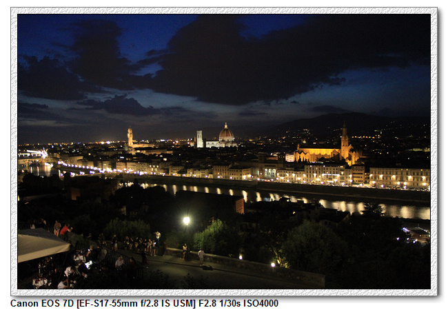 義大利這個時期,天黑時間大約都在晚上9點,因此晚餐後回到旅館休息 一下,直到9點我們才出門搭公車前往米開朗基羅廣場看夜景。因為手邊只剩下3張票,因此我們有點投機的方式,先搭公車抵達廣場之後,只待半小時,馬上再搭車回車站,這樣就完全在車票可使用範圍之內後 。加上據說夜晚的義大利不是很安全,大部分的網站都不建議太晚出門,但我們幾乎都在坐車,應該不會有太大的問題。