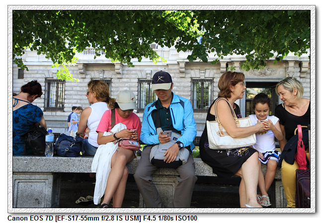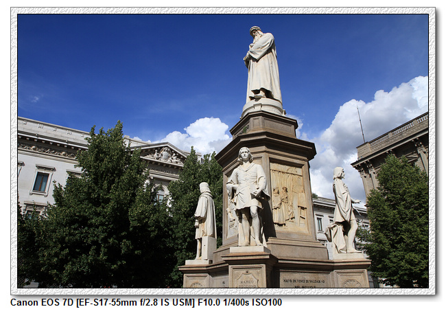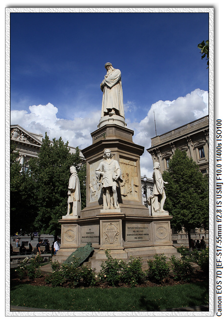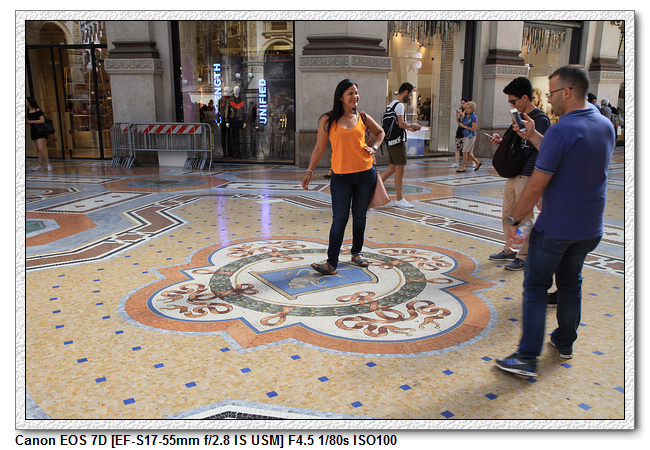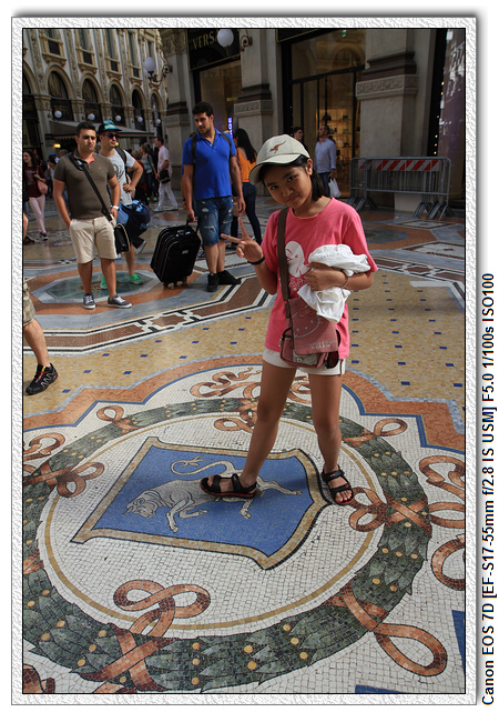 離開博物館後,沿著艾曼紐二世拱廊走到史卡拉劇院門口。艾曼紐二世拱廊基本上就是一個精品百貨商圈,對於不愛買精品的一家人,幾乎就是直接穿過拱廊直達史卡拉劇院門口的史卡拉廣場,坐著休息一下,再回中央車站前,讓小羽去用腳根踩住拱廊地板上金牛的一個洞拍照。