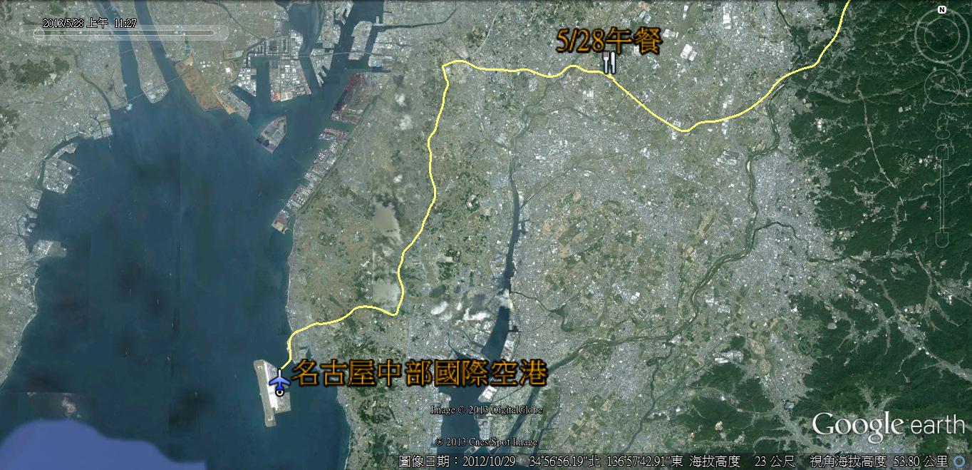 大約三小時的飛行時間,抵達名古屋中部國際空港。中部國際機場位於名古屋市南方的伊勢灣,是日本第三座填海造陸之機場,前兩座為長崎機場及大阪關西國際機場。機場在2005年2月啟用時,所有原由名古屋機場處理的商業航班便轉為由中部國際機場處理。
