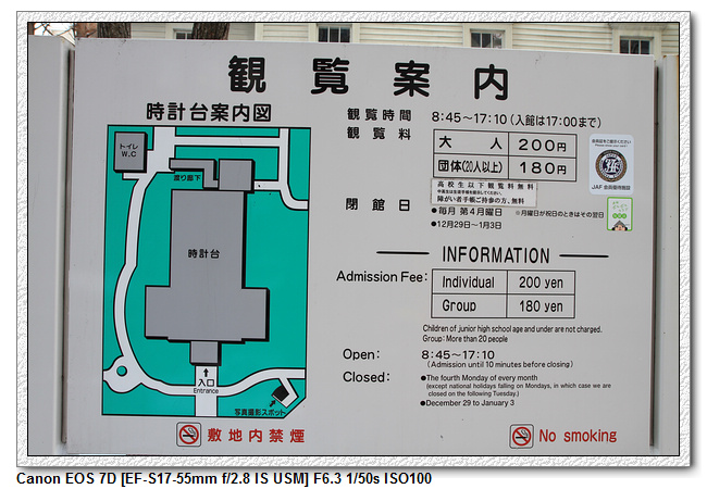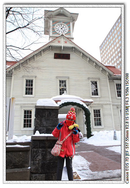 時計台就在午餐附近,轉個彎就到了。札幌市時計台,是日本北海道札幌市的著名地標,亦是北海道少數保存至今的美式建築,為日本19世紀引入西方教育以及北海道開墾時期的象徵,現已列為重要文化遺產,與北海道廳舊紅磚廳舍同為札幌市中心的主要觀光景點。其正式名稱是「舊札幌農學校演武場」,俗稱「札幌鐘樓」,或簡稱為「鐘樓」(時計台)。