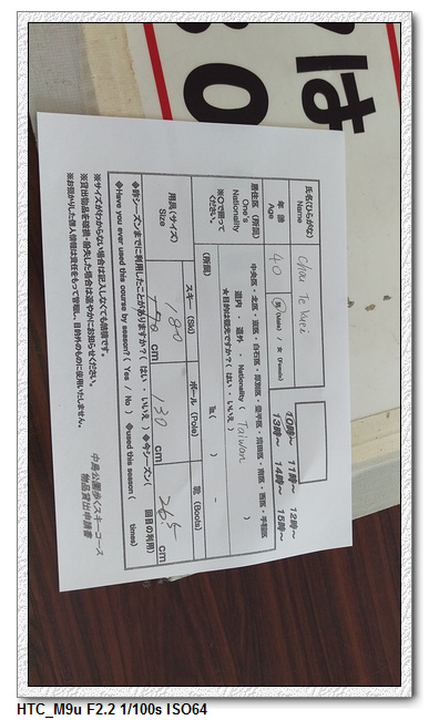 ▼【 填寫一些資料,就可租借了;填寫年齡、身高(雪板長度)、鞋size、雪杖長度】