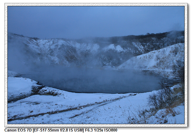 大正地獄是大正時代小型火山爆發時形成的周長為10米左右的池沼。它的溫泉水量成週期性反覆增減,最近有時還會突發性噴發出溫泉泥。此外,它的泉水顏色會週期性變化成灰色,綠色,藍色和黃色等7種顏色。天色已暗,只看到一種顏色。