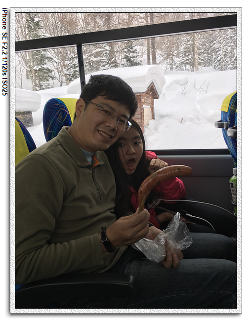 13:05準時開車出發前往留壽都,這班車人不多,整車大約不到10來人,上車後沒多久我們三人一路睡,直到中途休息區 。小羽累的不想下車,小羽爸媽只好自己下車逛逛。(休息時間約15分鐘,司機原來用日語說,我們硬是用英文問了一下,明明司機就會用英文回答) 。休息區內有數家熱食店以及販賣區,不大但東西算是齊全,後來買了一隻一百多元台幣的帶骨香腸,回到車上也已經十分鐘後了,還好不是最後一個上車。
