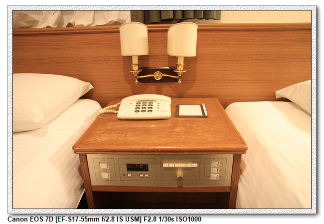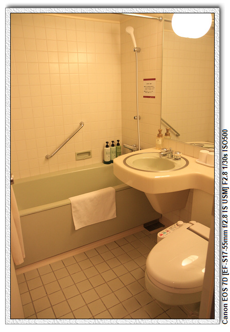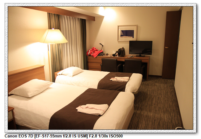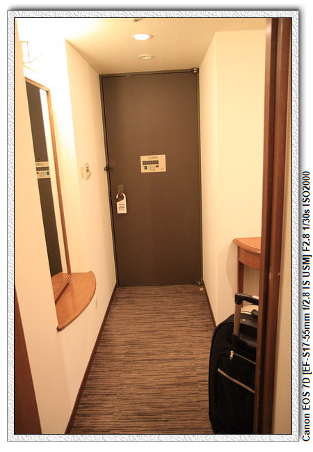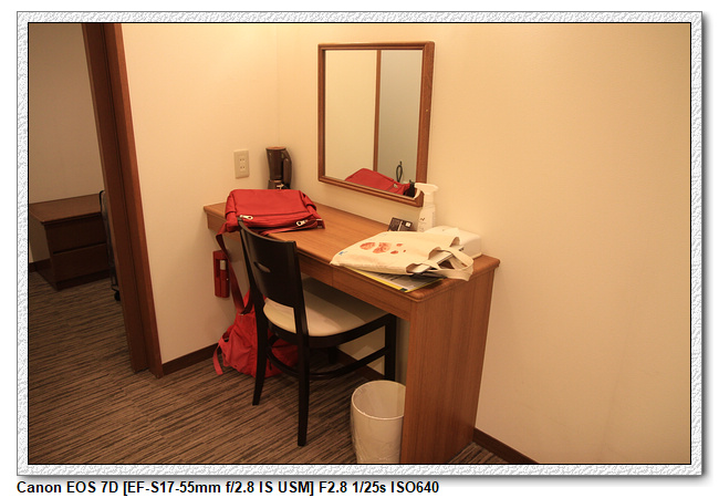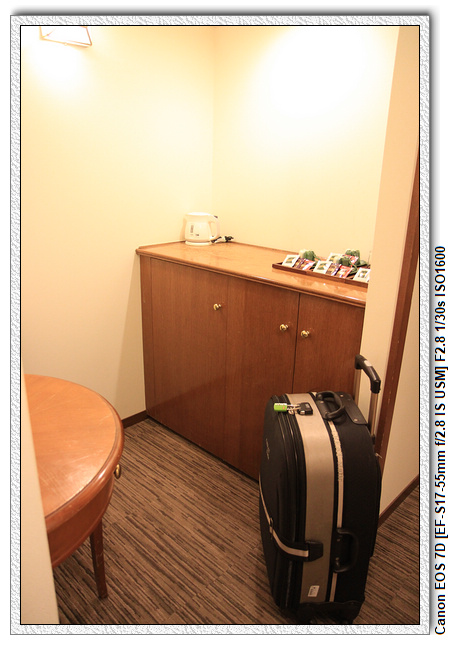 旅館最讚的是有很剛好的梳妝台,可以用來坐著吹頭髮、小羽戴角膜塑形片,有很棒的置衣間:可以平放兩個大行李箱。有三張床,其中有一個是小小加床,房間電燈很亮,還好有註明要無菸房,一出房間,七樓的走道,一整個是恐怖無法除去的煙味(隔天就好多了)。