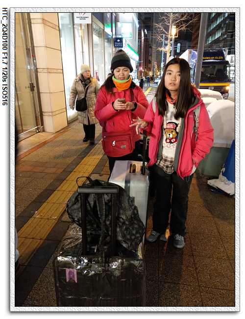 Hotel。原本小羽媽的計畫在是JR站下車,然後坐JR線到旅館,但沒想到我們是在某處的停靠處下車,我們只好一路在雪地裡拉行李,拉到旅館,小羽媽臉都要黑了。