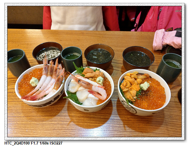 小羽這次換了一家店,小羽選了有甜蝦+鮭魚卵的丼飯,小羽媽五色丼飯,小羽爸海膽+鮭魚卵丼飯,一樣附有紫菜湯+抹茶(小羽不愛抹茶,一口都沒喝)。