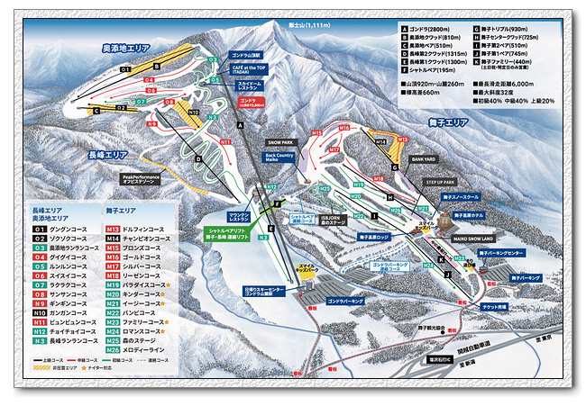 舞子高原山頂920m,最常滑走距離6000m,最大斜度32度,初級40%、中級40%、上級20%。