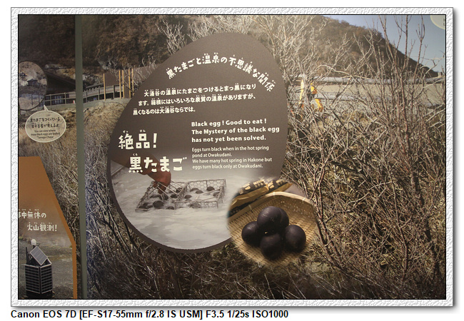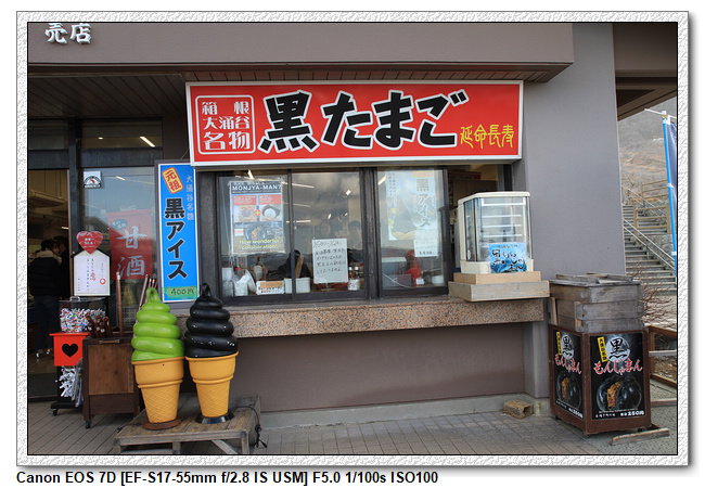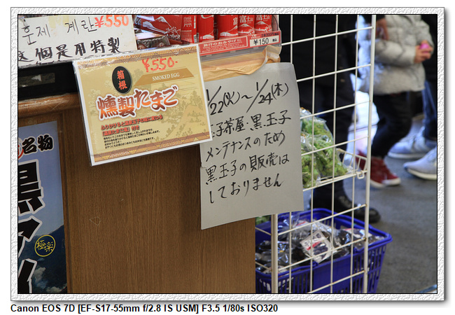 這裡有售賣黑色雞蛋的小店舖,黑玉子外觀是黑色的,但味道與普通雞蛋無異,黑玉子就是雞蛋用溫泉水煮,因為含鐵所以是黑色的,聽說吃一個可以延長7年的壽命。