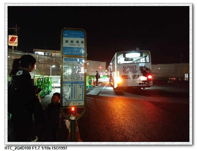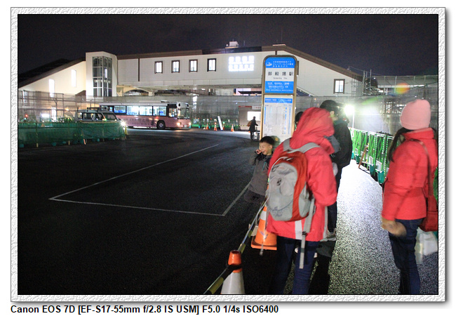 原本晚餐後就要搭車回飯店,但班次只有一小時一班,但等到時間都過了,還沒看到車子過來,依據日本人準時的個性,這應該不太尋常,有可能是我們跑錯地方等車了。同時有三位大陸遊客也遇到這個問題(應該是妹妹帶姊姊及姐姐的小孩),就在大家互相詢問以及問附近的學生,搞了一陣子之後,原來要回去的站牌是在車站的另一邊(箱根乙女口),所以這班公車我們一共等了2個多小時才搭到車。