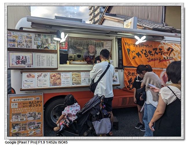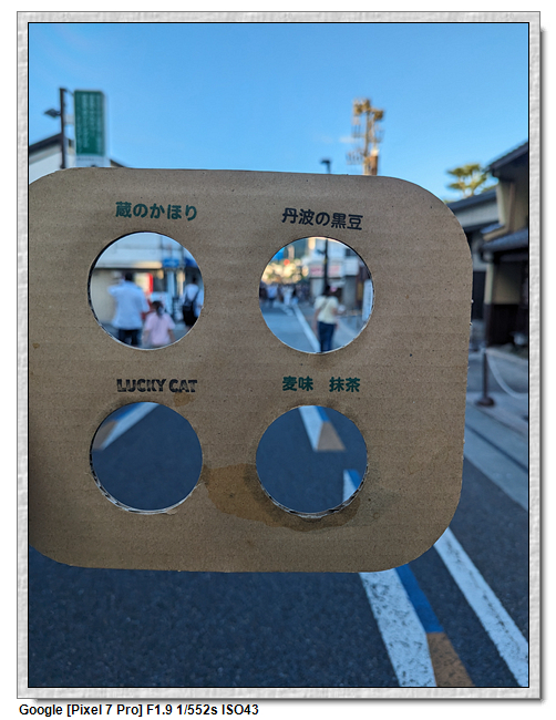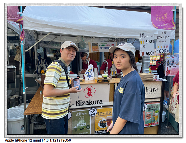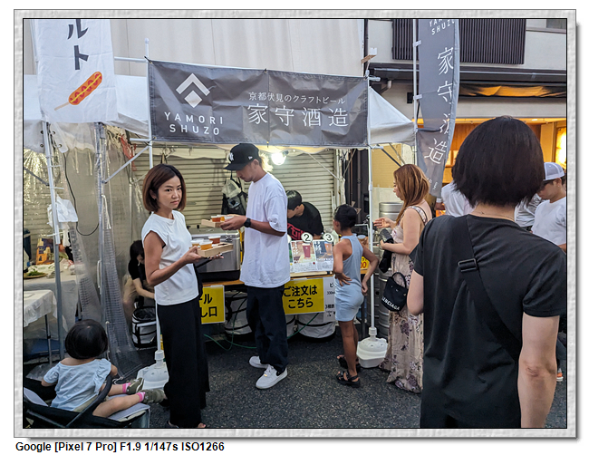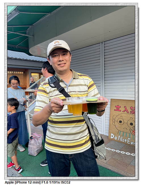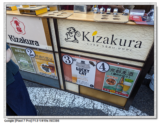 這條封街市集,很多人手拿啤酒,有手拿一杯啤酒的,也有一次拿四杯啤酒的(有紙板盛載),這條街似乎賣啤酒比賣吃的還多,小羽爸對於紙板四杯啤酒很有興趣,就找了一家啤酒看起來很特別的店。 這家也是四杯1000円,四杯不同的啤酒,四種酒分別是京都麥味(抹茶)、丹波の黑豆、黃櫻 LUCKY CAT 白愛爾、京都麦酒・蔵のかほり。 老實說,現在回想口感好像也想不起來,只記得抹茶的啤酒似乎有一點抹茶口感,黑豆的有點像是黑啤酒的口感。