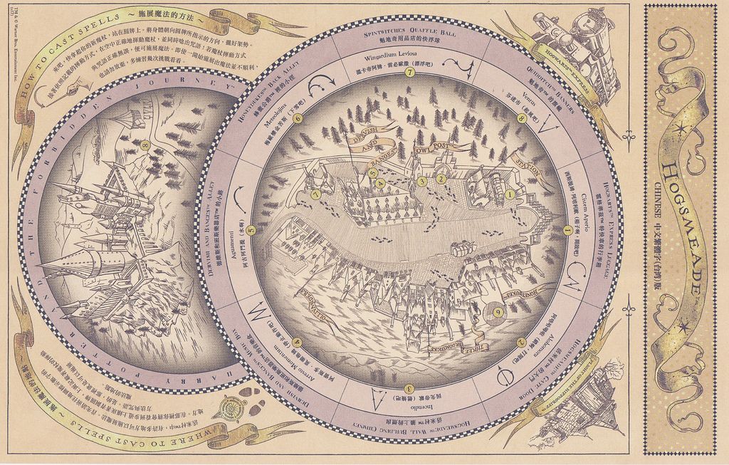 購買魔杖結帳時,店員稍微跟我們哈拉一下,問我們從哪來的,回答台灣後,就給我們一張縮小版的中文地圖(原本盒子裡有一張大裝的日文地圖)。地圖是記載園區哪裡可施展魔法以及魔杖手勢,一共有8處位置。