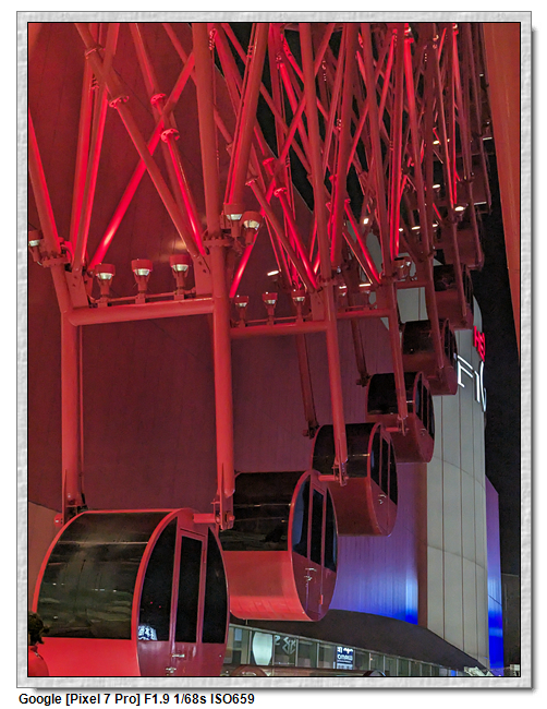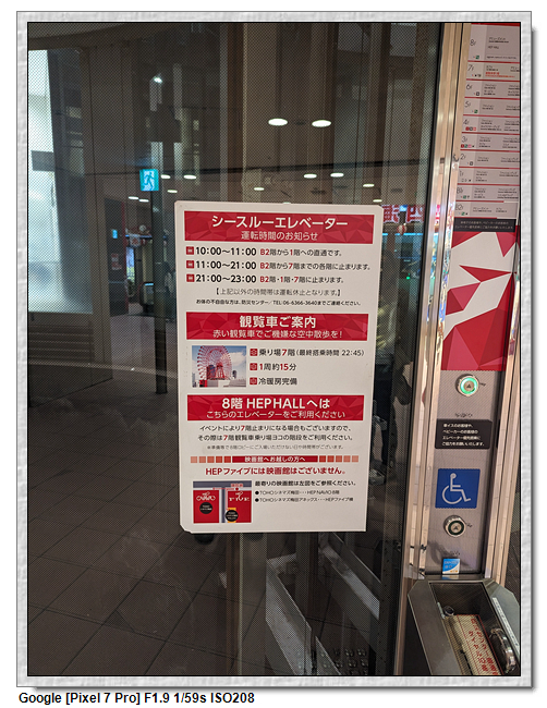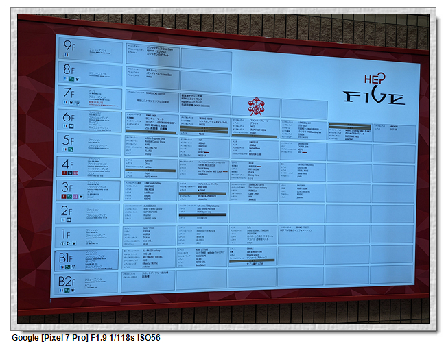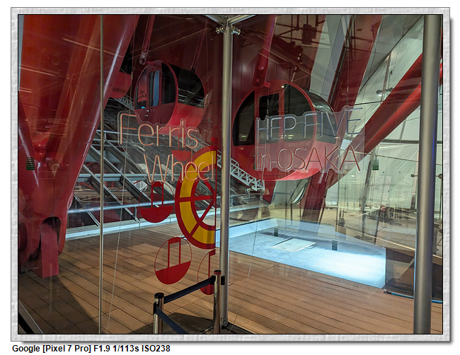 直徑 75 公尺的紅色摩天輪,位於 HEP FIVE 購物中心頂樓,HEP FIVE摩天輪也是可以免費使用周遊券的設施,也是少數這個時間點(20:00)能使用周遊券的設施。
