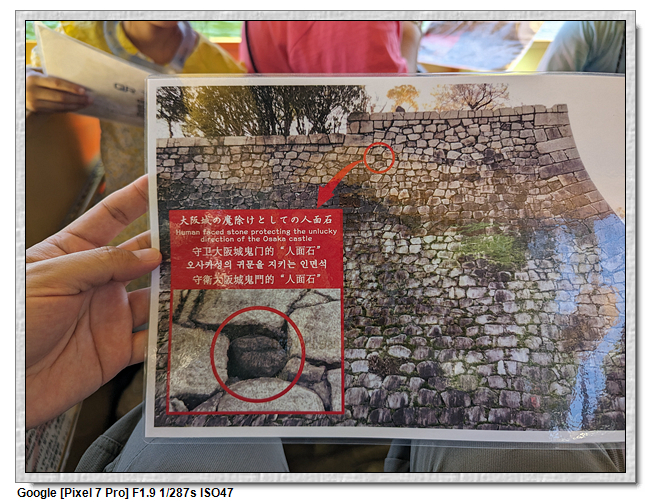 守衛大阪城鬼門的“人面石”,由於“人面石”位于本丸的東北方向,也就是鬼門的方向,因此據說是像鬼瓦一樣,為了驅魔而嵌入。