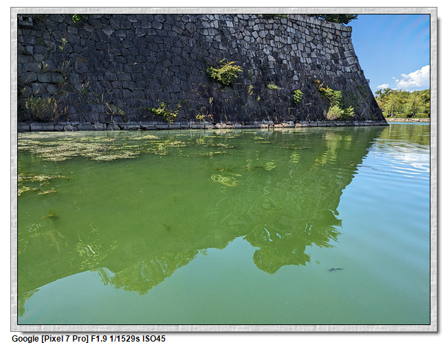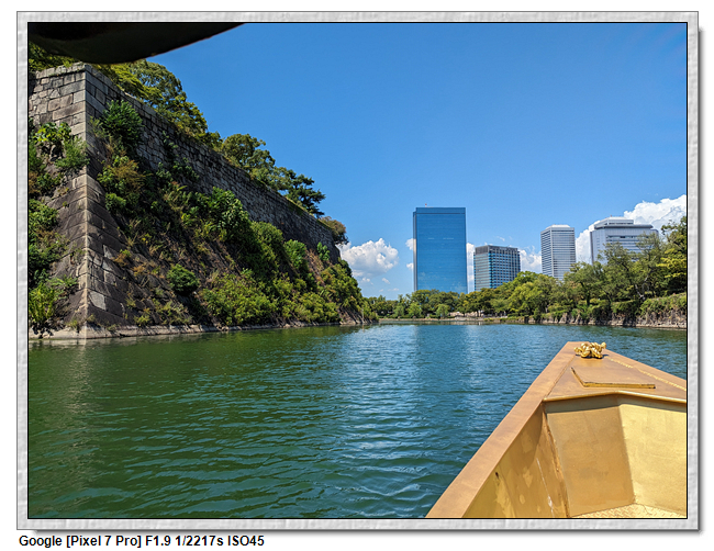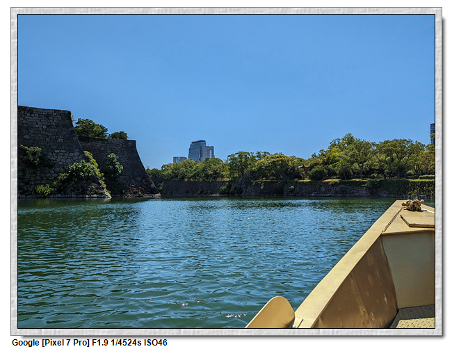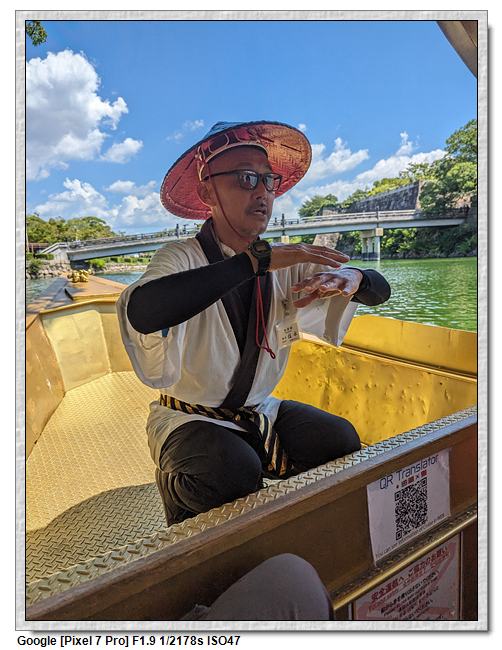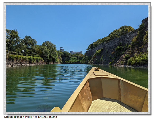 坐在船上遊覽內護城河,雖然有炎熱的太陽,但御座船緩慢的行駛帶來微風,稍微降低熱度,乘船時間約20分鐘,稍微可以舒緩最近爆酸的雙腳。