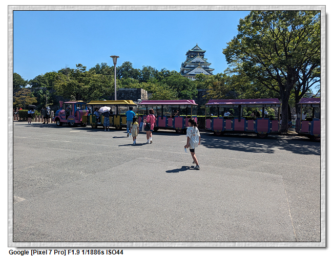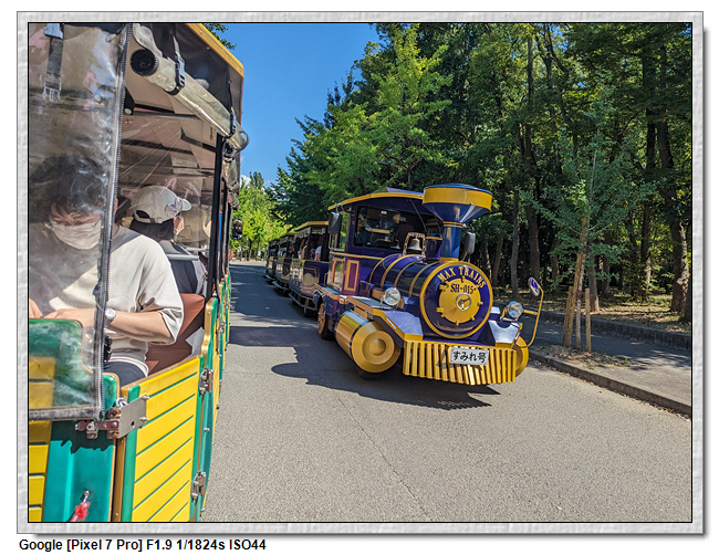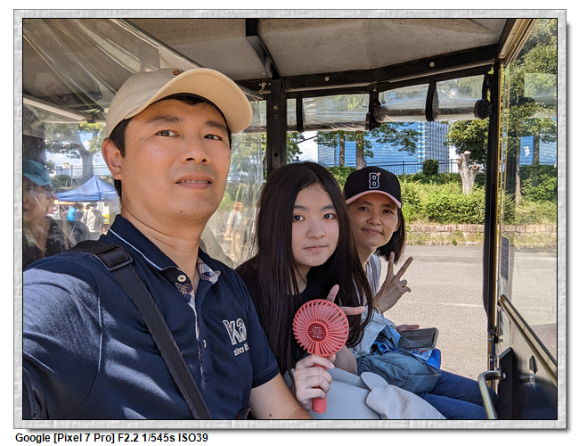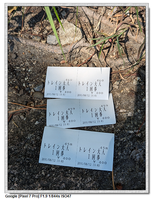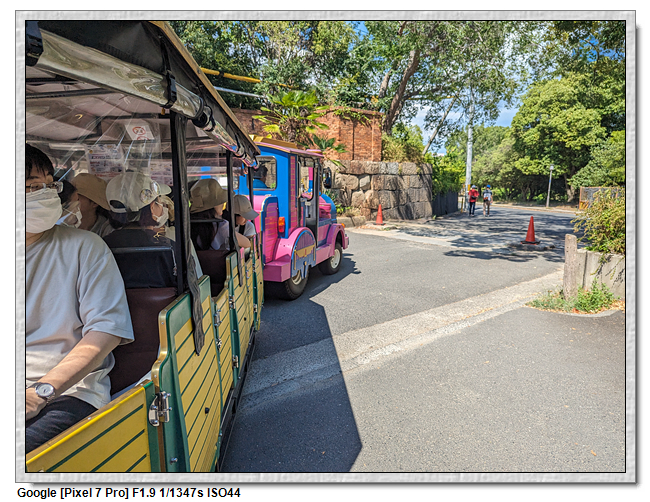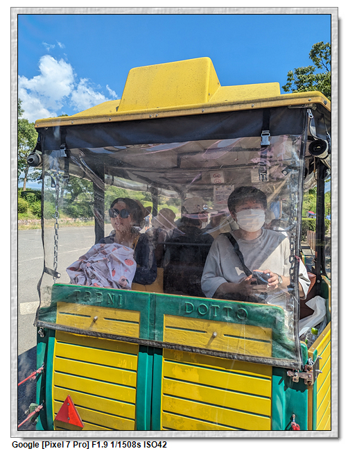 結束遊船,要前往車站繼續下個行程,但看了一下車站位置,再看看炙熱的天氣,然後身旁有台小火車,我們就很自然的選擇坐小火車去車站,小火車需自費,一人400円,此時可以理解為什麼單程小火車這麼多人坐。 乘坐時遇到一群應該也是台灣客的家族出遊,男生選擇用走的,幾位婦孺則是坐小火車。13:54坐上小火車,預計14:03開。抵達時,那群男生說等很久,他們兩點就走到了,我們才剛出發,感覺不需走很久,但我們就是不想走路。